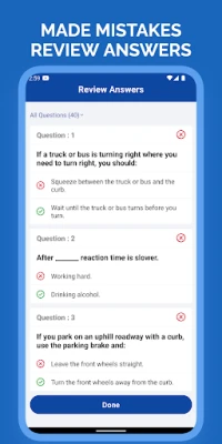 * Extensive Question Bank: The app contains a vast database of practice questions meticulously designed to cover all aspects of the test. Our app contains questions on topics such as road signs, traffic laws, safe driving practices, and more.