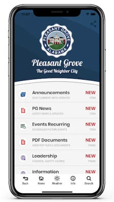Welcome to the official app for the City of Pleasant Grove, Alabama! The City of Pleasant Grove is the kind of place most Americans would like to have as their hometown. With a population of about 10,000, Pleasant Grove offers the best "small-town" life quality but within only a 25 minute drive of Alabama's largest metropolitan area. Whether youre a resident, visitor or a business owner, you will enjoy convenient access to all the information you need to live, work and play in Pleasant Grove.