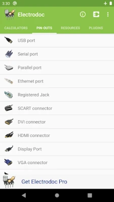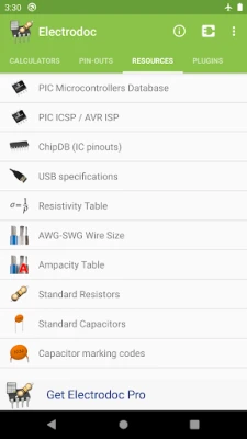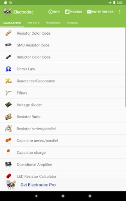 These are the extra calculators and pinouts available at the moment only in the PRO version: Lookup Resistor color by value, Zener Diode Calculator, Y-Δ Transformation, Decibel Converter, RMS Converter, Range Converter, Power Over Ethernet, VESA Connector, PC peripheral connectors, MIDI/Game port, Apple 30-pin connector, PDMI, Trailer connectors, SD card pin-out, SIM/Smart card, Raspberry Pi pin-out, LCD pin-out, GPIB/IEEE-488 pin-out, Thermocouples colors, Arduino boards, JTAG pinouts, BeagleBone boards, SMD Package Sizes, 7400 series IC, PT100 Conversion Table, Fuses color code, Automotive Fuses colors, DIN 47100 color coding, IP marking, World Plugs & Sockets, IEC Connectors, NEMA connectors.