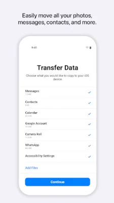 Everything about iOS is designed to be easy. That includes switching to it. With just a few steps, you can migrate your content automatically and securely from your Android device with the Move to iOS app. No need to save your stuff elsewhere before switching from Android. The Move to iOS app securely transfers all kinds of content data for you:
