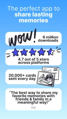 With more than five million downloads and a rating of 4.1 stars, we’re the postcard app you trust to send your postcards and printed products to loved ones at home and internationally.
