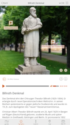 Alle von beyondarts für die Universität Wien programmierten Guides bieten neben Text und Bildern auch eine mehrsprachige Audiofunktion, ein Audio-Guide mit spannend erzählten Geschichten für das eigene Smartphone.